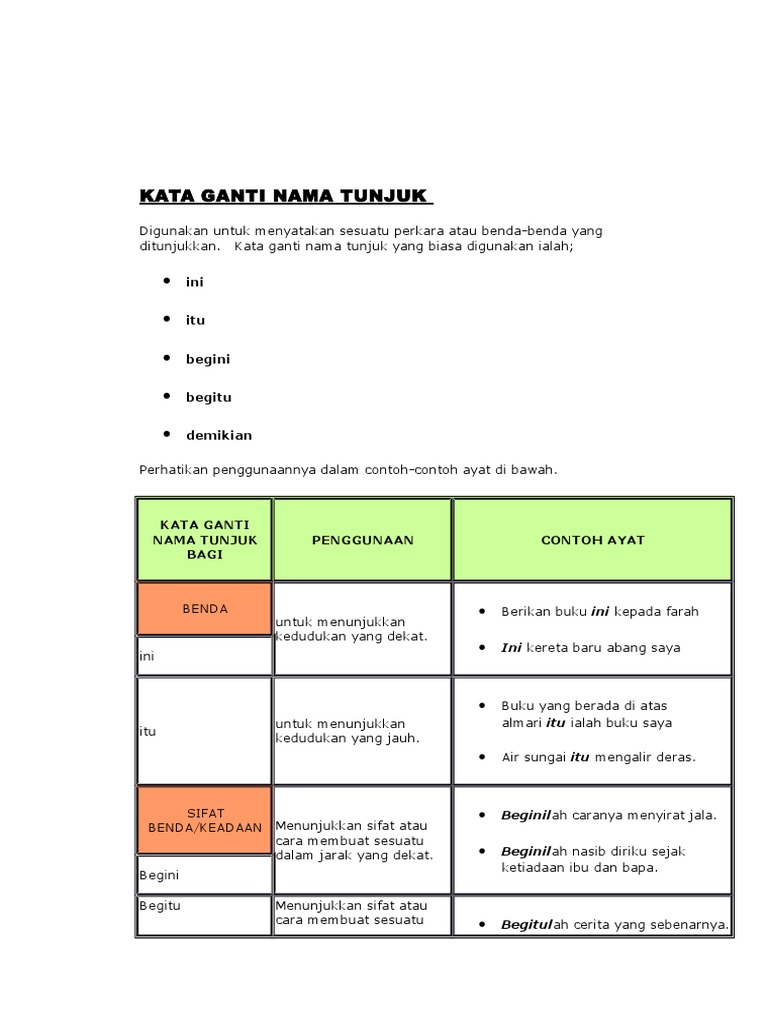Kata ganti nama tunjuk ialah perkataan yang menjadi pengganti kata nama dan membawa maksud menunjukkan benda atau perkara atau tempat. Tidak ada siapa-siapa dalam bangunan itu. Diri Pertama Diri Kedua saya aku kami anda awak patikhamba kamu tuanku kita kalian Terdapat 3 bahagian Kata Ganti Nama Diri Diri Ketiga Beliau mereka dia baginda nya.
